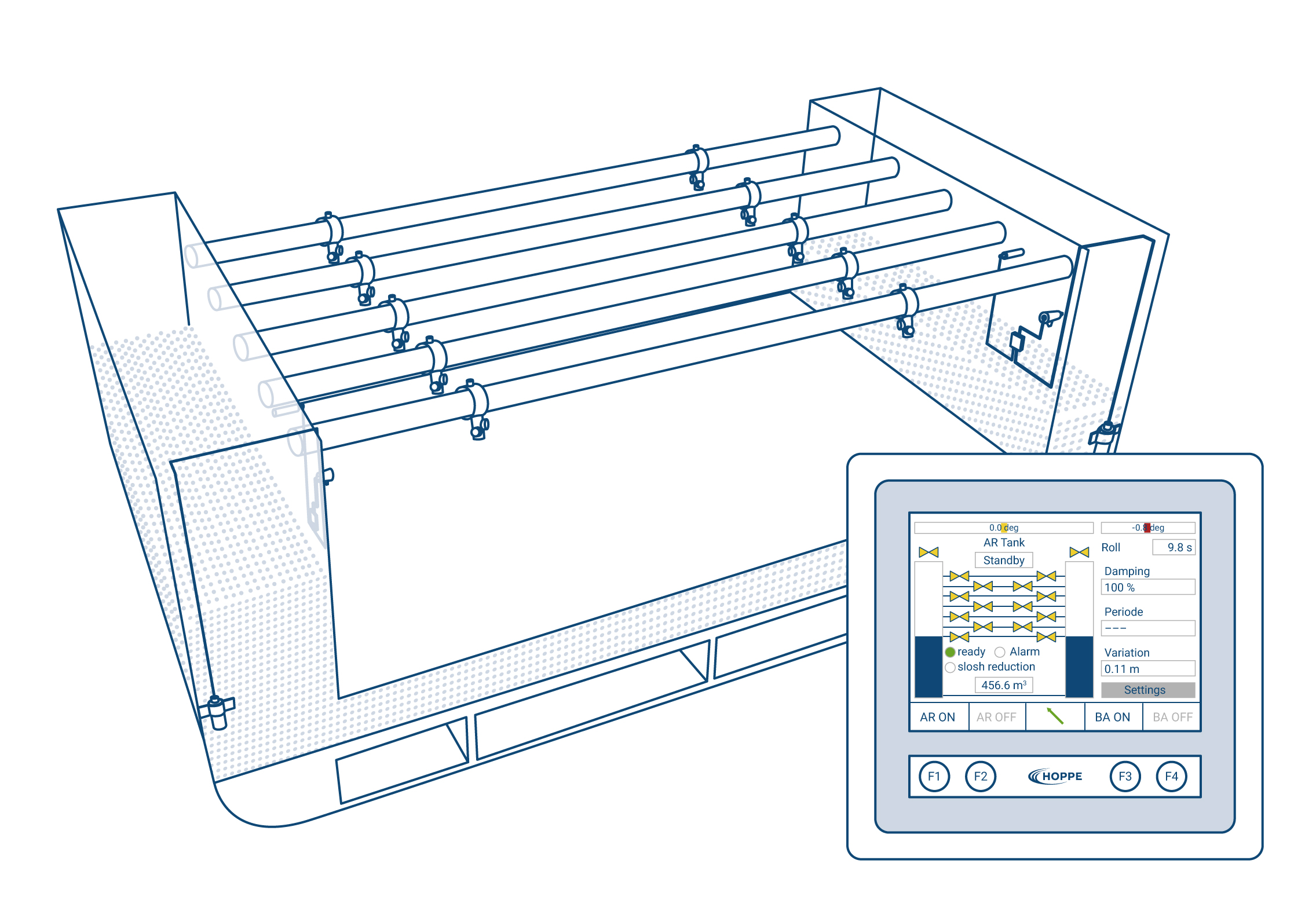 Hoppe Marine offers a unique range of highly effective, cost-efficient and low-maintenance rolling damping systems. Each tank design is individually matched to the vessel and model tested to offer the crew more safety and comfort, but also to increase the possible cargo.
